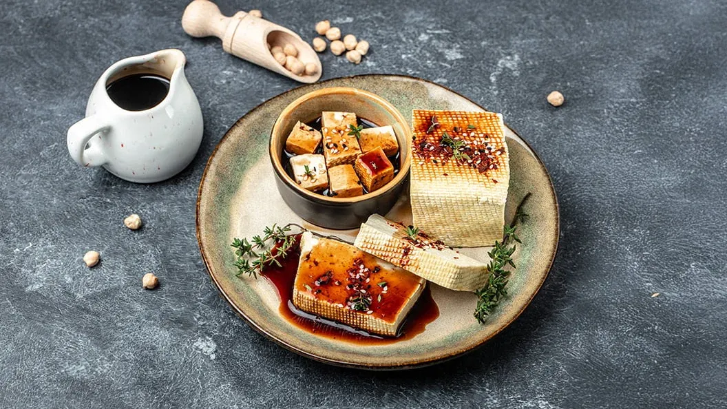 - Tofu: olio d'oliva, olio di arachidi, Salsa di Soia Kikkoman o Marinatura Teriyaki Kikkoman, aceto di riso, aglio, cipollotto — il tofu assorbe facilmente qualsiasi tipo di marinatura. È ideale per il "meal prep": più riposa, più il sapore diventa intenso.