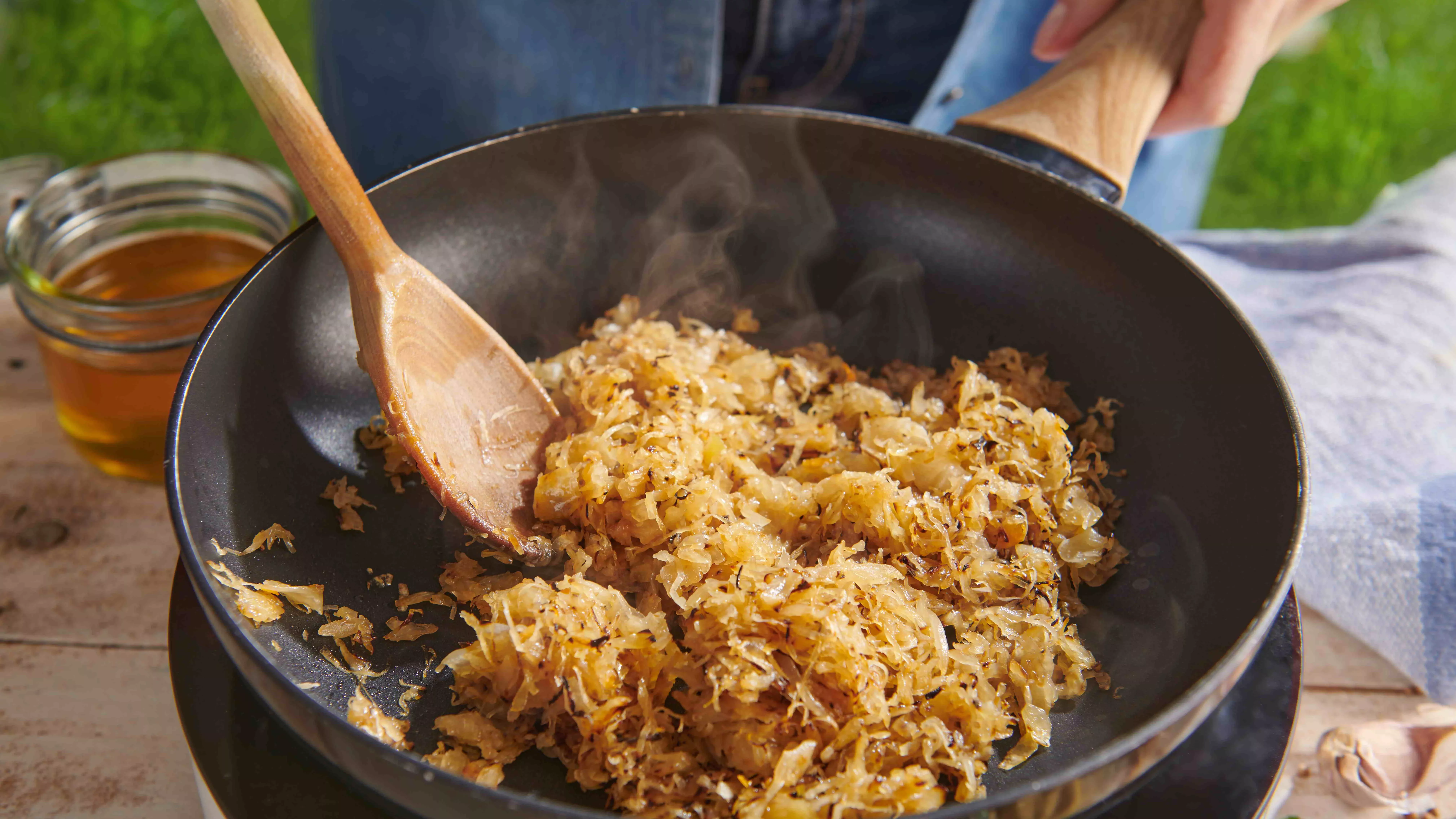 Servire le fette di carne con i crauti fritti e i cetriolini a fette sul pane spalmato di senape.
