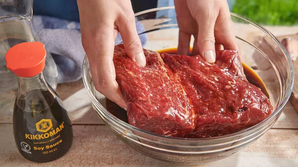 Mescolare lo zucchero di canna, la salsa di soia Kikkoman, il Condimento in stile Mirin dolce Kikkoman e l’acqua. Mettere la carne nella marinata e conservare in frigorifero per 1 - 2 giorni.