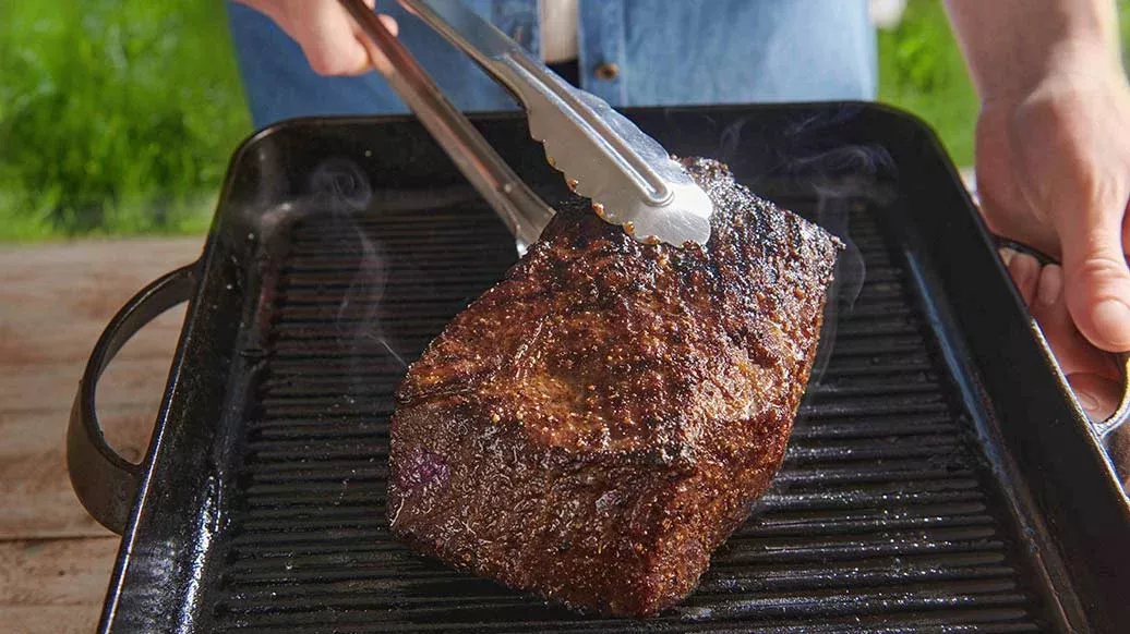 Posizionare la carne sulla griglia e lasciare cuocere per 30 - 40 minuti, girando di tanto in tanto a seconda del livello desiderato di cottura. Lasciare riposare la carne per 10 minuti o più dopo la cottura, quindi tagliarla a fette sottili.