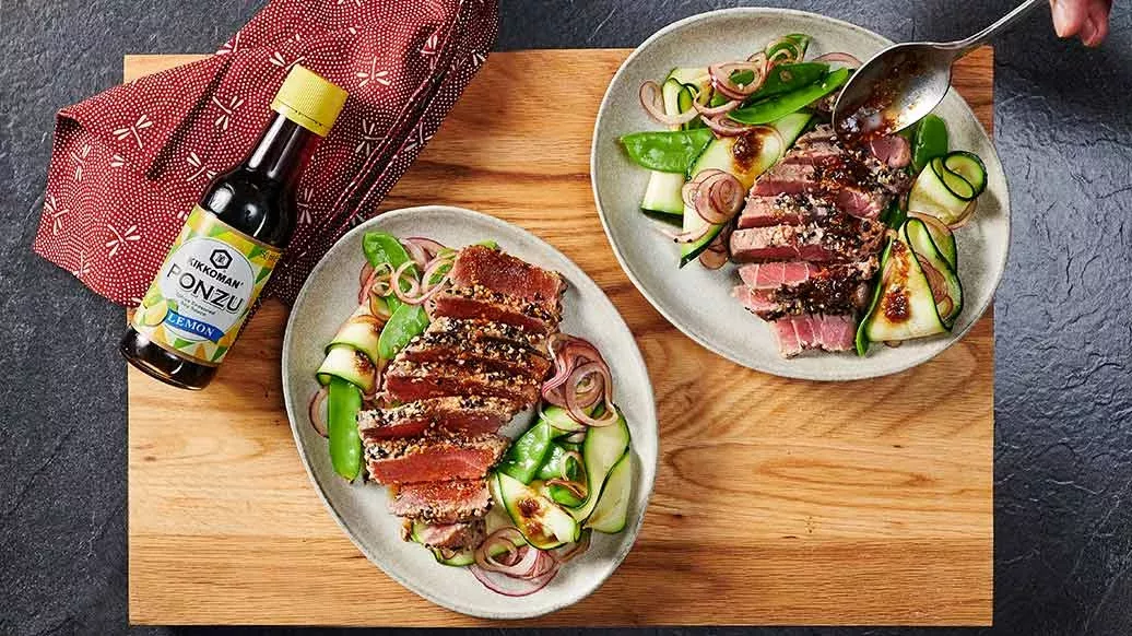 Mescolare i semi di sesamo in un piatto. Rimuovere la bistecca di tonno dalla marinata, lasciar scolare e impanare nei semi di sesamo. Mettere in padella e cuocere per 1 minuto su entrambi i lati, a fuoco alto. Togliere la bistecca dalla padella, versarvi la marinata e il resto della salsa Ponzu di soia e limone, lasciar bollire per 2 minuti e togliere dal fuoco. Tagliare il tonno a strisce di circa 1 cm. Per la disposizione nel piatto: suddividere le verdure, disporvi sopra le strisce di tonno e versarvi la salsa calda.
