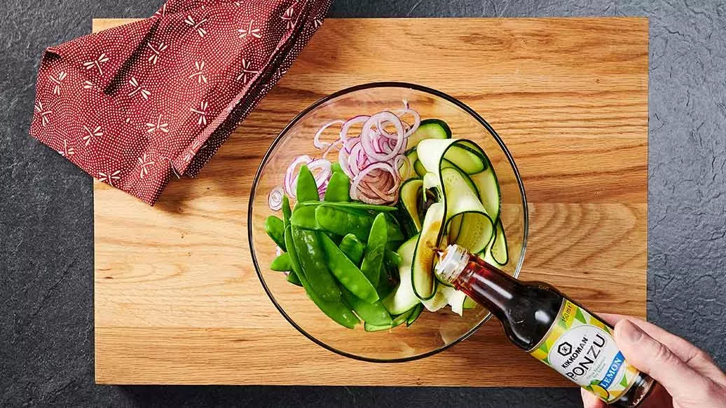 Preparare le verdure: pelare i piselli, cuocere per 4 minuti in acqua salata, scolare, coprire con acqua fredda e collocare in una ciotola da insalata. Tagliare a striscioline le zucchine piccole e grattarvi sopra la cipolla rossa con una grattugia fine. Aggiungere 1 cucchiaio di salsa Ponzu di soia e limone alla verdura, mescolare e mettere da parte.