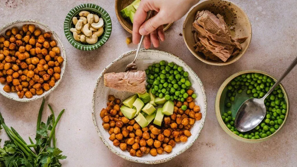 Aggiungere l'avocado a dadini, i piselli verdi cotti e il tonno scolato nella ciotola con i ceci caramellati.