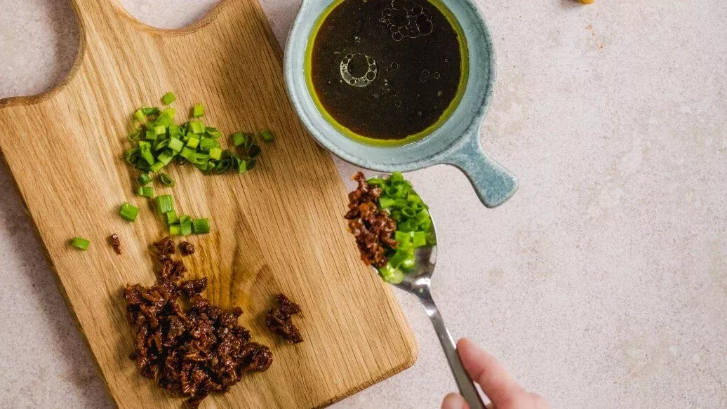 1 cucchiaio Salsa di Soia a Fermentazione Naturale Kikkoman – 1 cucchiaio di olio d'oliva – 2 cucchiai di succo di lime – 2 cucchiai di pomodori secchi sott'olio – 1 cucchiaio di erba cipollina tritata – 2 cucchiai di anacardi per il topping – Prezzemolo per guarnire