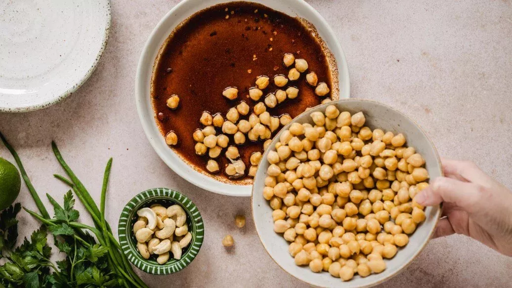 300 g di ceci cotti – 2 cucchiai Salsa Teriyaki Marinata Kikkoman – 1 cucchiaio di sciroppo d'acero – 1 cucchiaino di paprica affumicata – ½ cucchiaino di peperoncino tritato