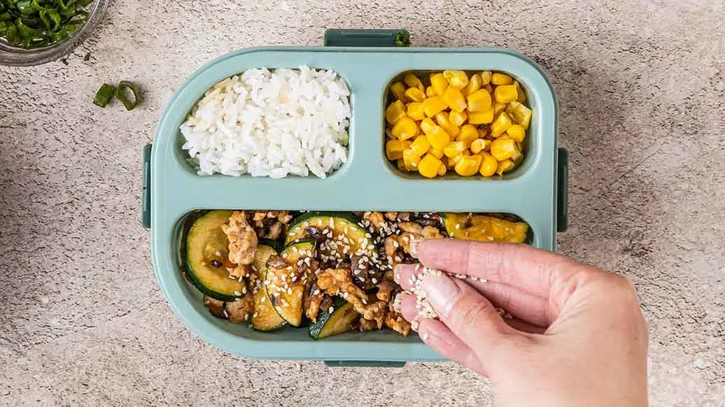 Cuoci il riso seguendo le istruzioni sulla confezione. In una ciotola, crea degli strati con il riso cotto, il mais dolce e la carne saltata con zucchine e cipolla. Cospargi con i semi di sesamo e il cipollotto, e irrora con la Salsa di Soia Kikkoman.