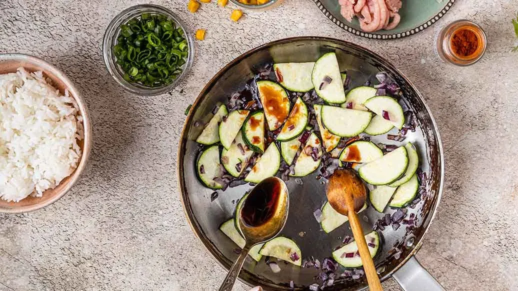 1 cucchiaio di olio vegetale – 1 cipolla rossa – 150 g di macinato di tacchino – 1 cucchiaio Salsa di Soia a Fermentazione Naturale Kikkoman – ½ cucchiaino di paprika affumicata – ½ zucchina