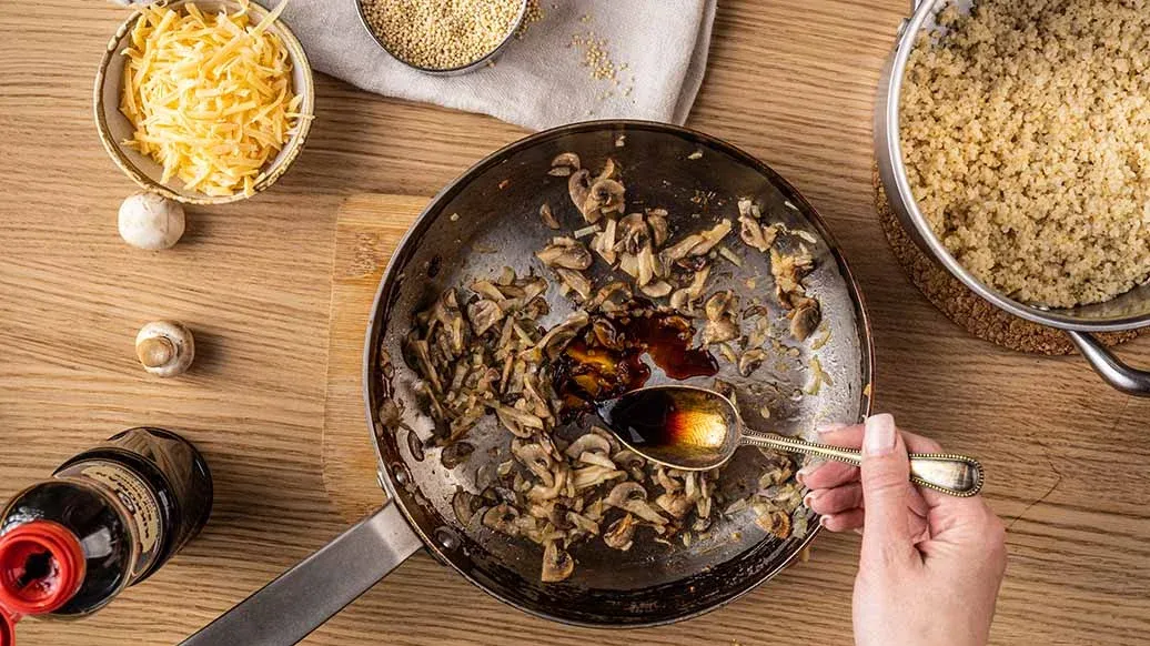 Cuoci il miglio seguendo le istruzioni sulla confezione, finché non sarà soffice. Affetta finemente i funghi. Scalda 1 cucchiaio di olio in una padella e soffriggi la cipolla per 1 minuto, poi aggiungi i funghi e cuoci per 3-4 minuti finché non si saranno ammorbiditi. Incorpora la Salsa di Soia Kikkoman, mescola bene e metti da parte a raffreddare.