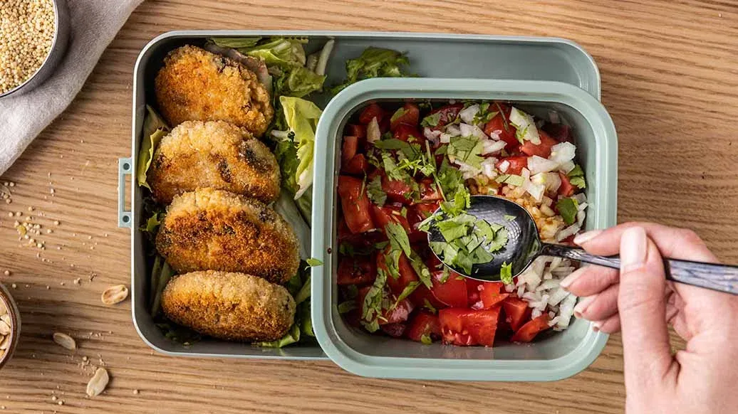 Taglia i pomodori a dadini e trita finemente la cipolla. Aggiungi la Salsa di Soia Kikkoman, l'Olio di Sesamo Tostato Kikkoman e il coriandolo tritato. Mescola bene. Con un cucchiaio, disponi il composto su un piatto insieme ai burger di miglio fritti e cospargi con le arachidi poco prima di servire.