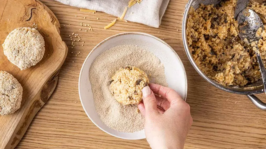 Una volta raffreddati, unisci i funghi e le cipolle saltate al miglio. Aggiungi il formaggio grattugiato, l'uovo, la Salsa di Soia Kikkoman e la farina. Mescola accuratamente e forma dei burger (ad es. 6-8 burger piccoli). Passali nel pangrattato e friggili nell'olio per 3-4 minuti per lato finché non saranno dorati.