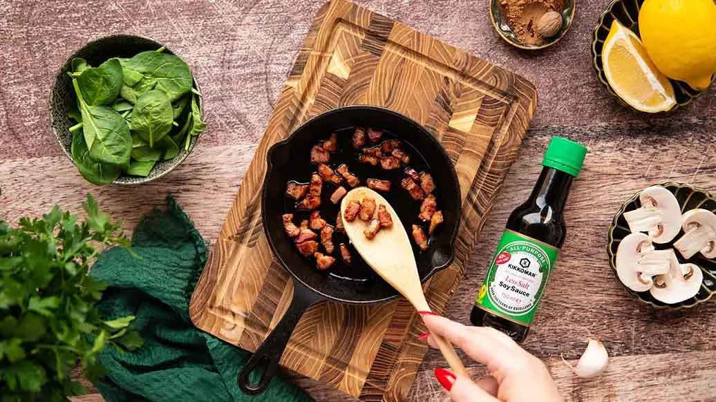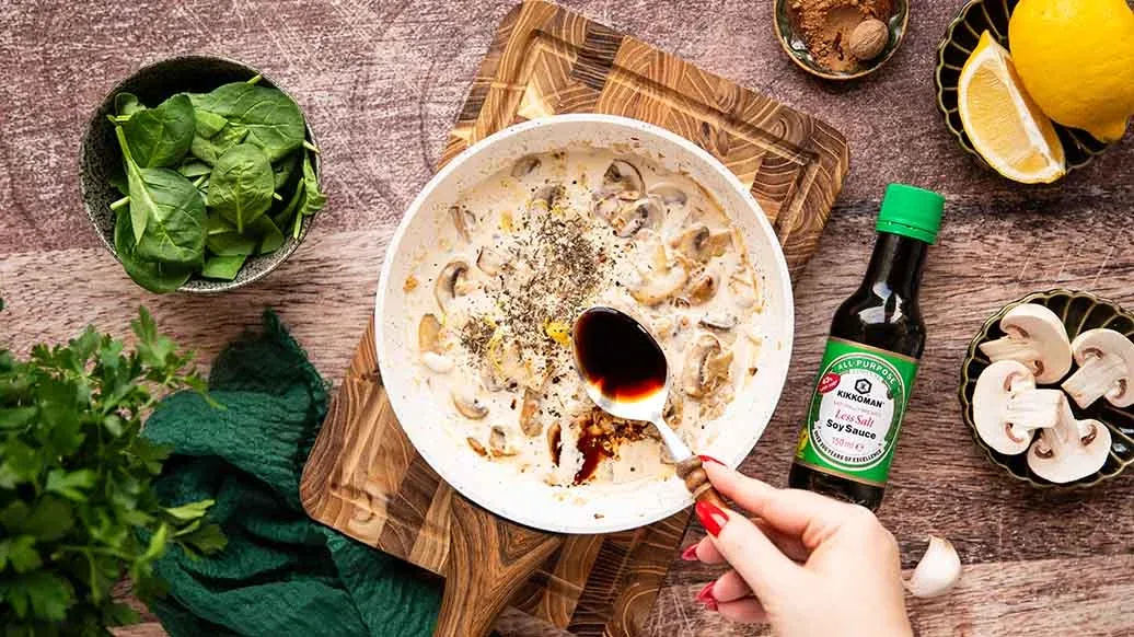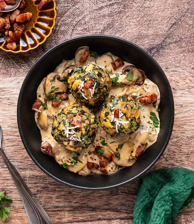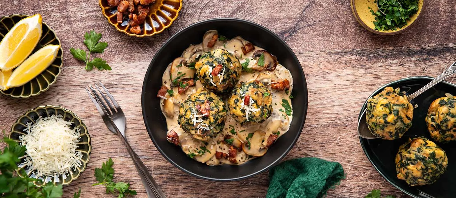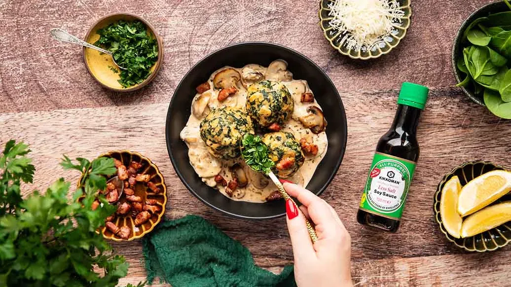 Canederli leggeri agli spinaci preparati con panini avanzati, insaporiti con Salsa di Soia a Ridotto Contenuto di Sale Kikkoman e serviti con una cremosa salsa ai funghi e un po’ di pancetta croccante. Un piatto semplice e confortante che permette di utilizzare al meglio il pane avanzato.