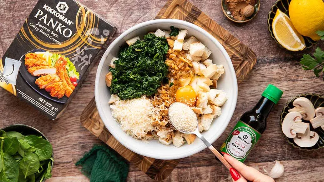 10 g di burro – 180 g di spinaci novelli finemente tritati – 40 g di cipolla finemente tritata – 60 ml di latte – 1 ½ cucchiaio Salsa di Soia a Fermentazione Naturale a Tasso Ridotto di Sale – ⅓ cucchiaino di pepe nero macinato fresco – ¼ cucchiaino di noce moscata – 150 g di panini raffermi, a dadini – 15 g di Grana Padano grattugiato – 1 ½ cucchiaio Panko Kikkoman - Pangrattato in Stile Giapponese – 1 uovo