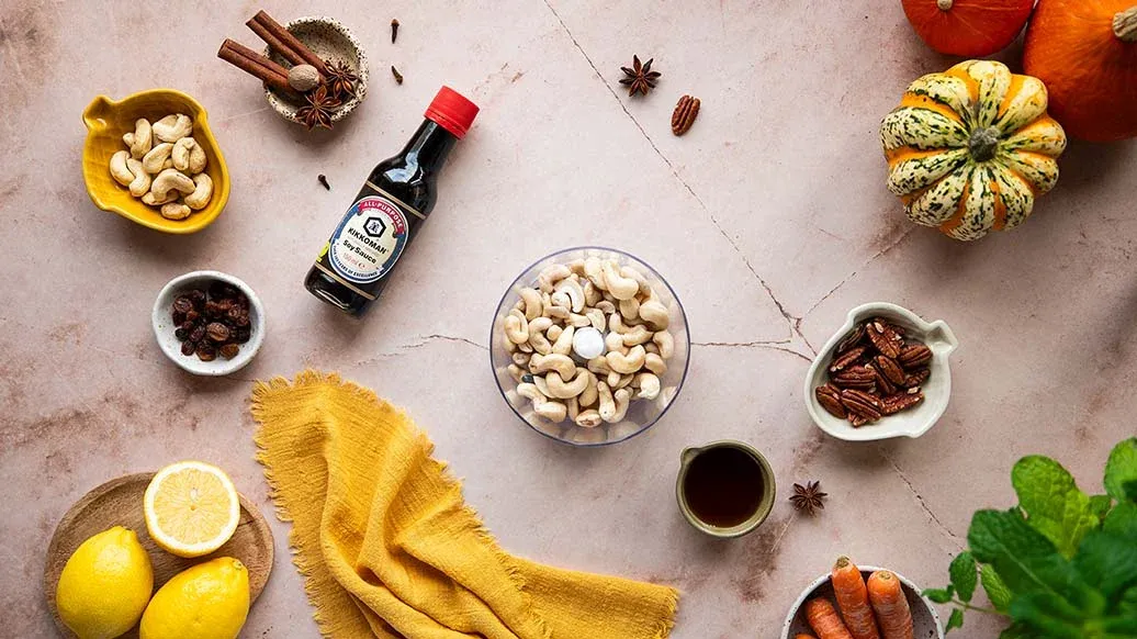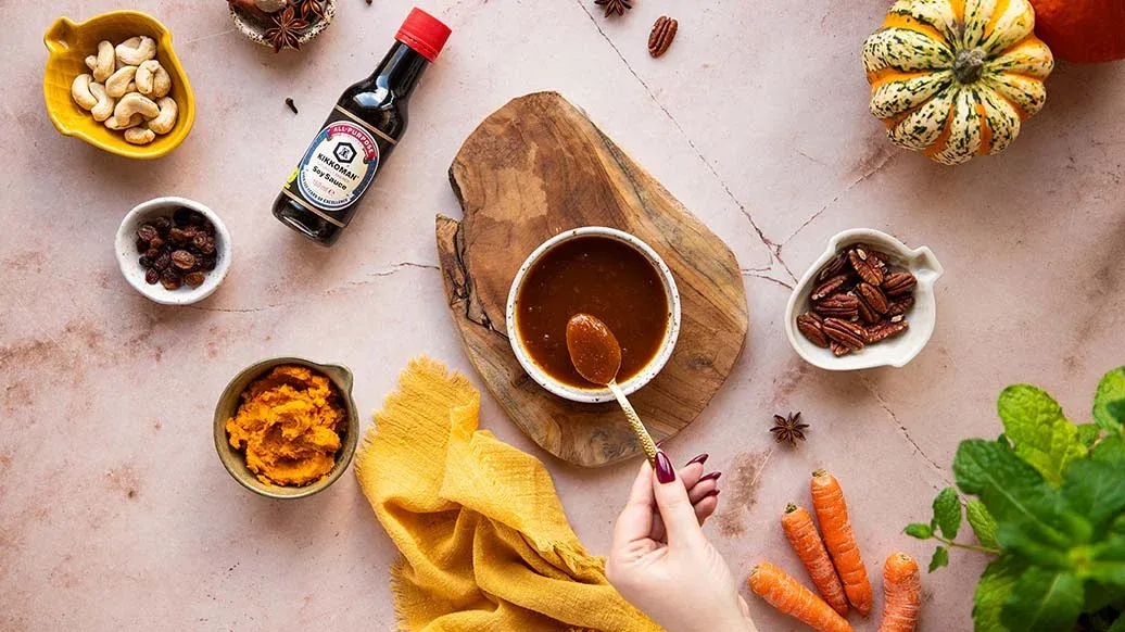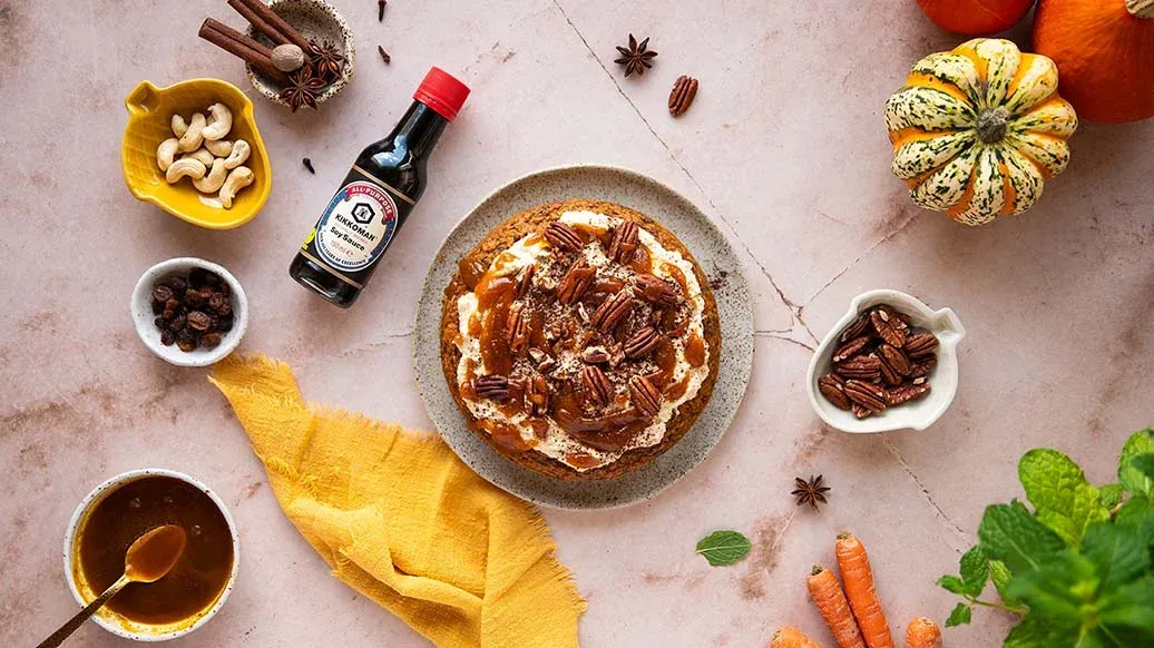 Una torta di carote vegana con una morbida glassa agli anacardi, croccanti noci pecan e uno sciroppo alle spezie di zucca aromatizzato con Salsa di Soia Kikkoman - avvolgente, equilibrata e con una delicata profondità umami.