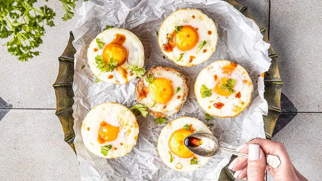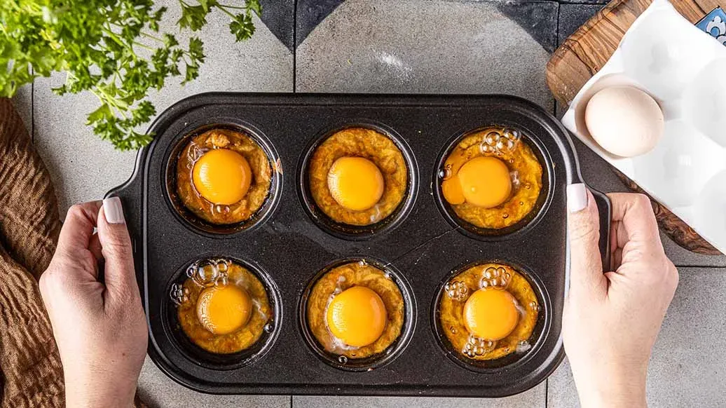 Rompi un uovo in ogni stampo per muffin. Rimetti in forno e cuoci per altri 10 minuti.