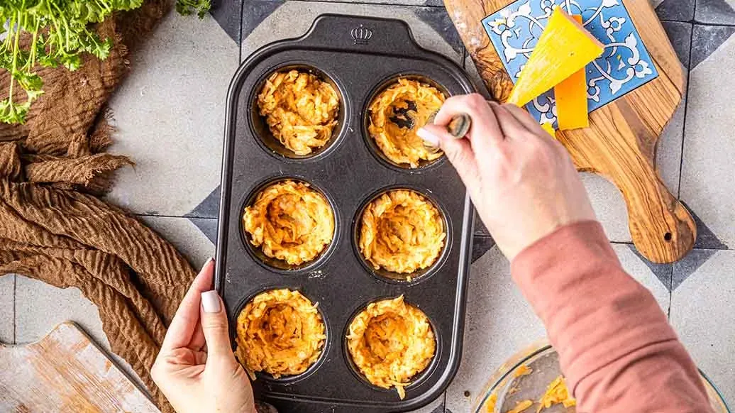 Ungi una teglia per muffin con dell’olio. Premi il composto di patate sul fondo e sui lati di ogni stampo. Condisci con l'olio rimanente e cuoci a 190 °C per 10 minuti.