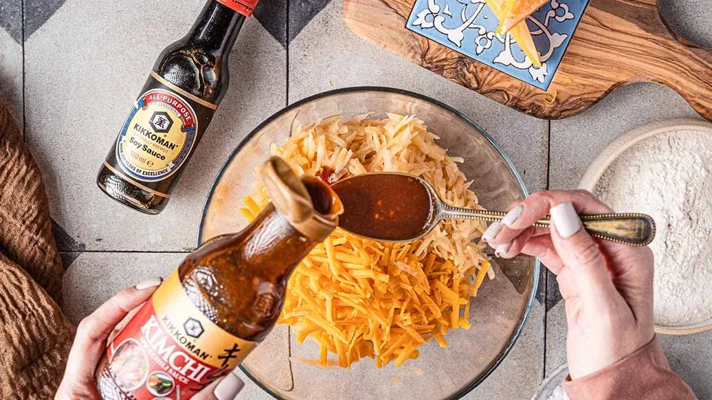 Grattugia le patate e mettile in un colino sopra una casseruola. Copri con un foglio di alluminio e lascia riposare per 10 minuti. Strizza il succo in eccesso e metti le patate strizzate in una ciotola. Aggiungi il formaggio grattugiato, la Salsa Kimchi Piccante Kikkoman, la Salsa di Soia Kikkoman, la farina, la fecola di patate e il pepe e mescola bene.