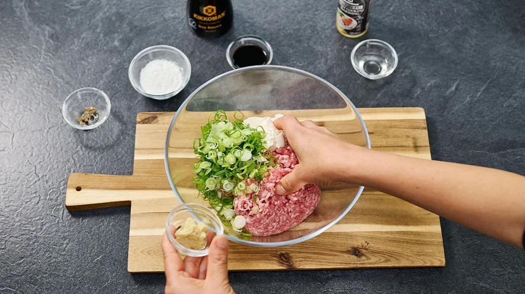 400 g di carne macinata, a tua scelta – 100 g di tofu – 1 cucchiaio Salsa di Soia a Fermentazione Naturale Kikkoman – 1 cucchiaino Condimento Dolce da Cucina in Stile Mirin Kikkoman – 2 cucchiaini di zenzero grattugiato – 3 cipollotti, tritati finemente – 2 cucchiai di amido di mais – Un pizzico di pepe nero