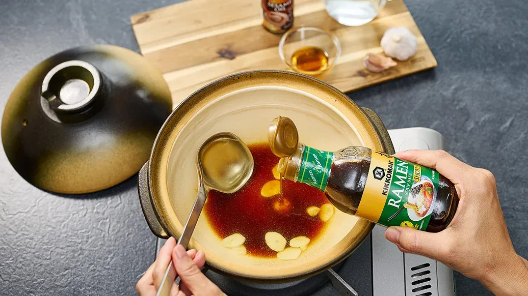 Aggiungi l'acqua, la Base per Zuppa di Ramen Kikkoman, l'Olio di Sesamo Kikkoman e l'aglio a fettine nella pentola.