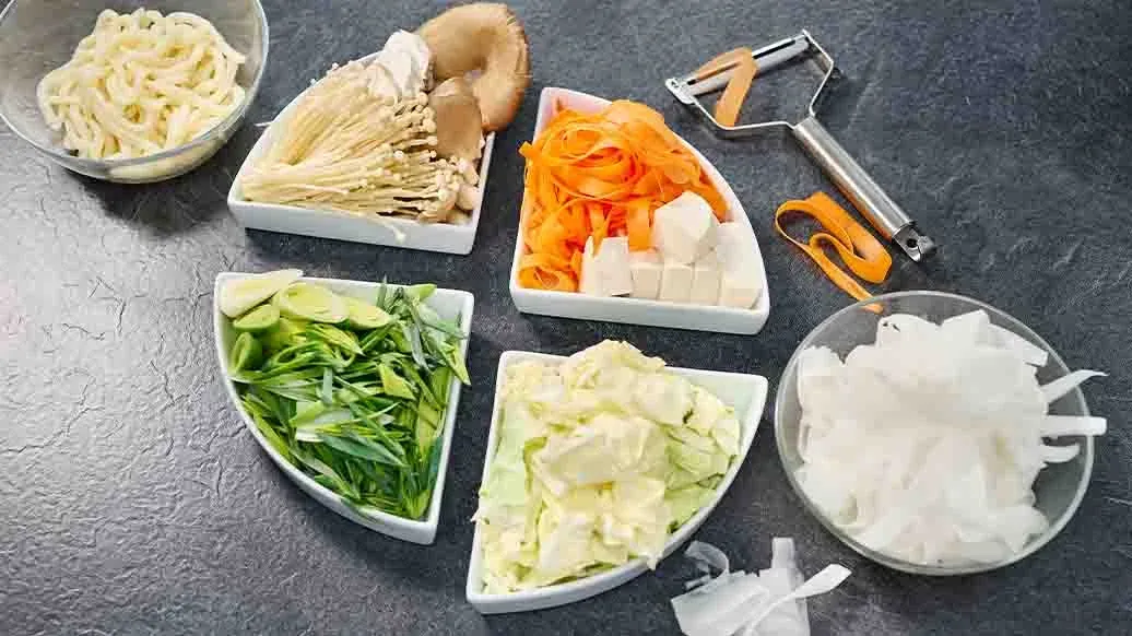 Taglia il cavolo in pezzetti. Affetta il porro in diagonale. Se necessario, rimuovi i gambi dai funghi e mettili da parte. Usa un pelapatate per affettare il daikon e le carote in sottili striscioline (come se fossero delle tagliatelle). Taglia il tofu in 8 pezzi.