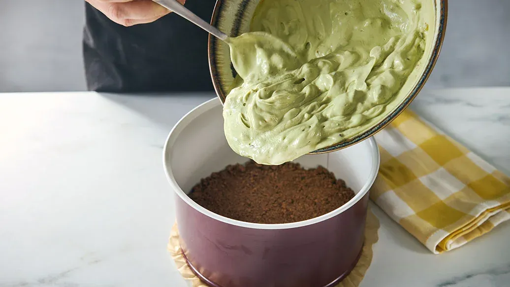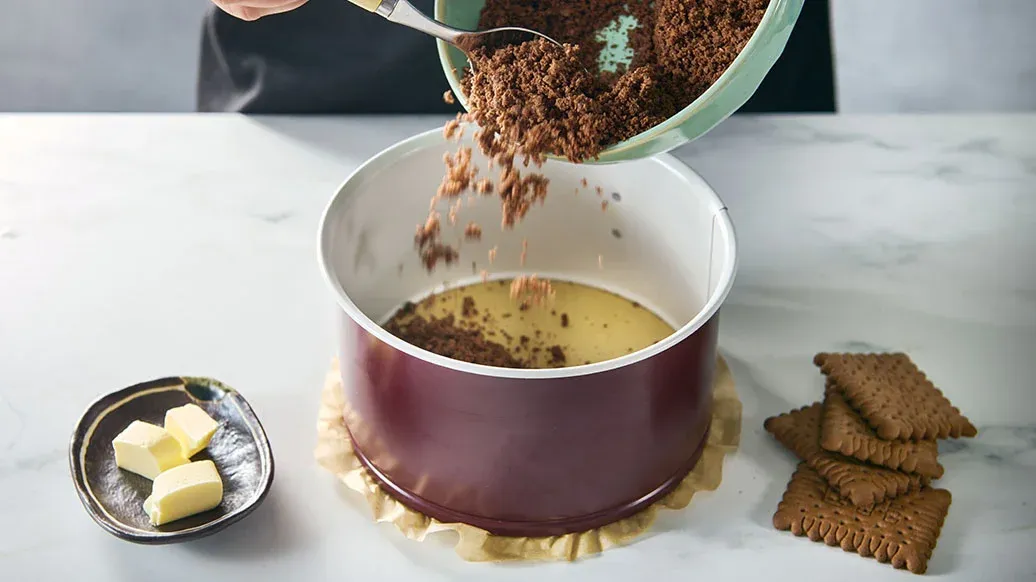 Scalda il burro e frullalo con i biscotti in un robot da cucina, poi disponi il composto sul fondo di uno stampo da forno (del diametro di 18 cm). Metti in frigorifero per 30 minuti.