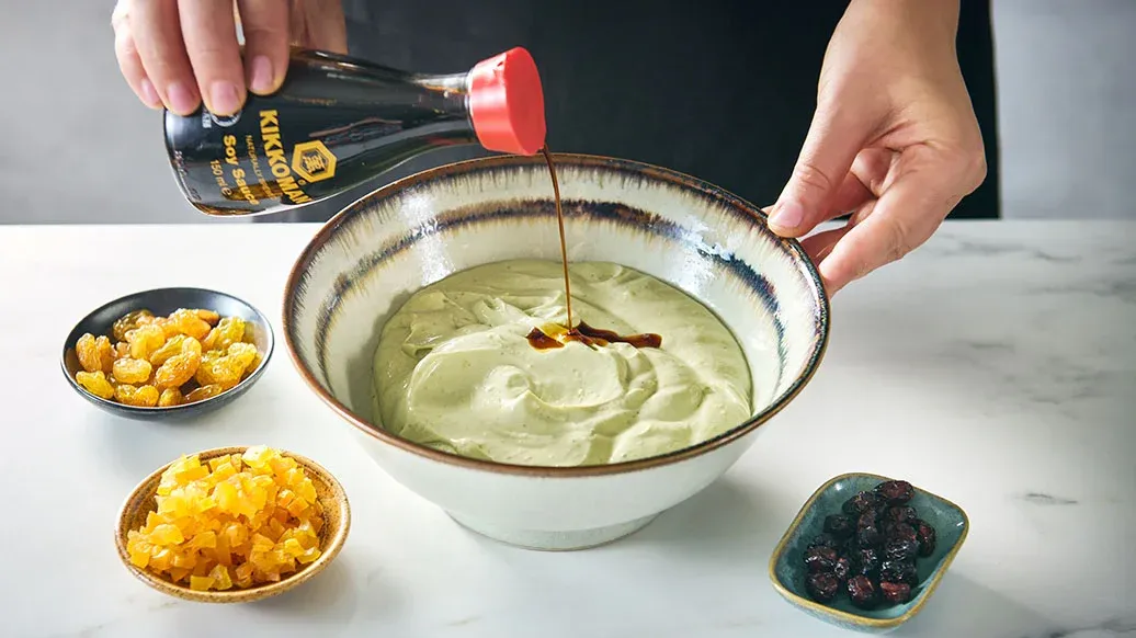 Mescola il formaggio, il tè matcha, lo zucchero a velo, la farina di frumento, la scorza di limone, la scorza di arancia, l'uovo e la panna acida fino a ottenere un composto liscio. Aggiungi la frutta secca finemente tritata e condisci con la salsa di soia Kikkoman.