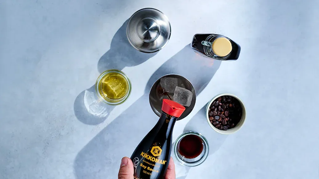 40 ml di whisky scozzese – 40 ml di liquore allo cherry – 120 ml di espresso (2 tazzine) – 20 ml di sciroppo d'acero – 2 gocce Salsa di Soia a Fermentazione Naturale Kikkoman – 16 cubetti di ghiaccio (peso di ciascun cubetto circa 20 g)