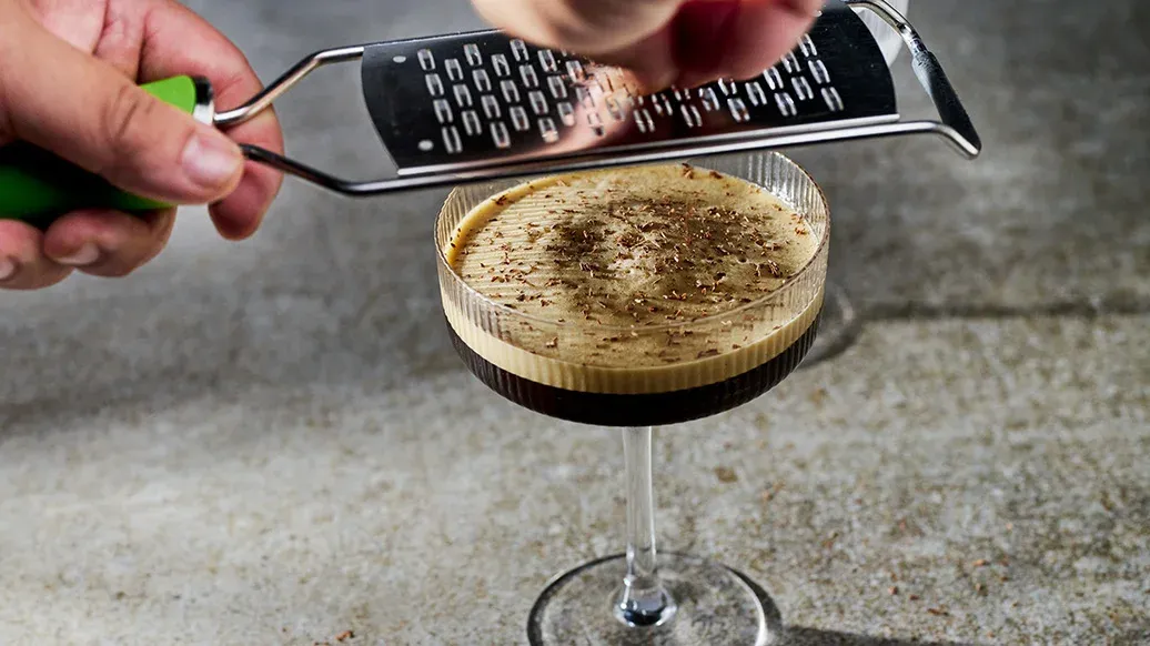 Filtra il mix senza ghiaccio nei bicchieri da cocktail e decora ciascuno con il cioccolato grattugiato.