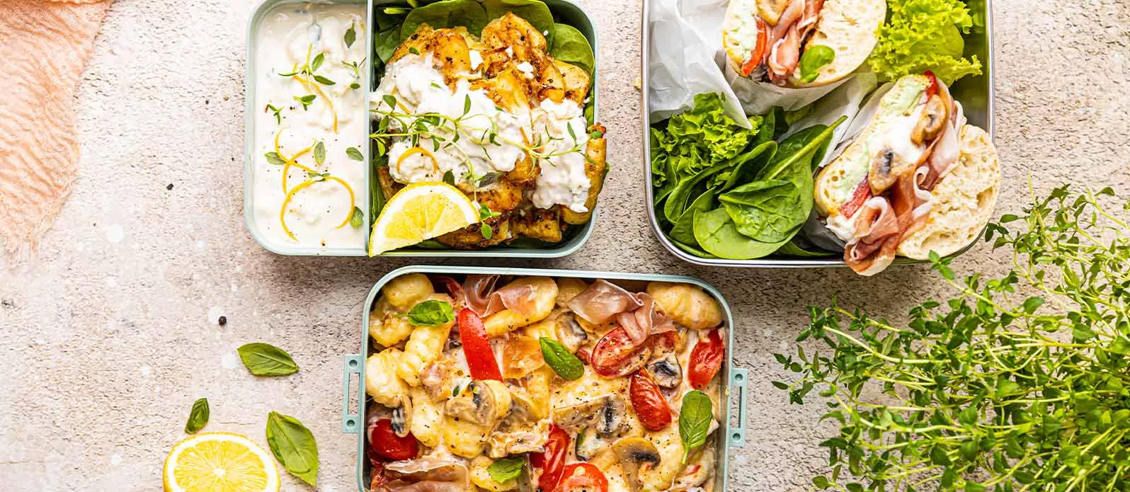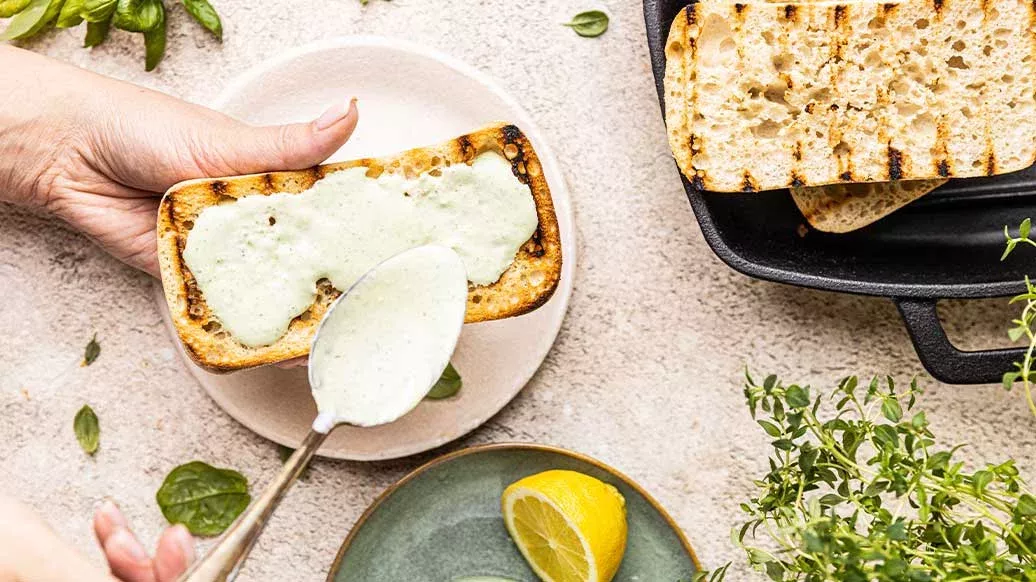 2 ciabatte – 150 g di yogurt greco – 1 spicchio d'aglio – 2 cucchiaini Salsa di Soia a Fermentazione Naturale Kikkoman – 1 cucchiaio di basilico tritato – 1 cucchiaio di foglie di timo – 30 g di foglie di spinaci – ½ limone – 1 cucchiaino di miele