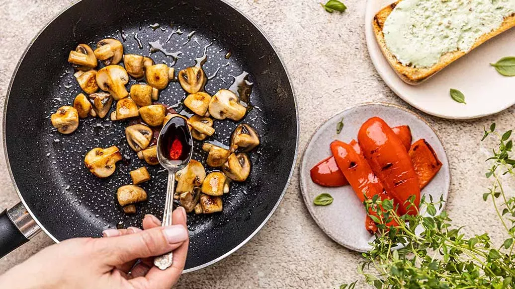 ½ peperone rosso – 1 cucchiaio di olio d'oliva – 1 cucchiaino di burro – 100 g di funghi – 2 cucchiaini Salsa di Soia a Fermentazione Naturale Kikkoman – 1 cucchiaino di miele