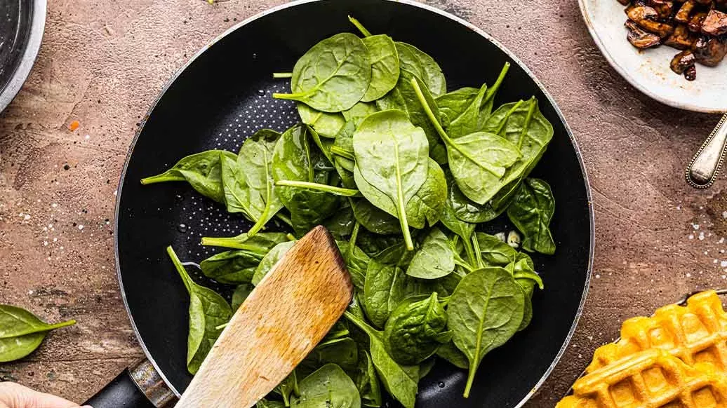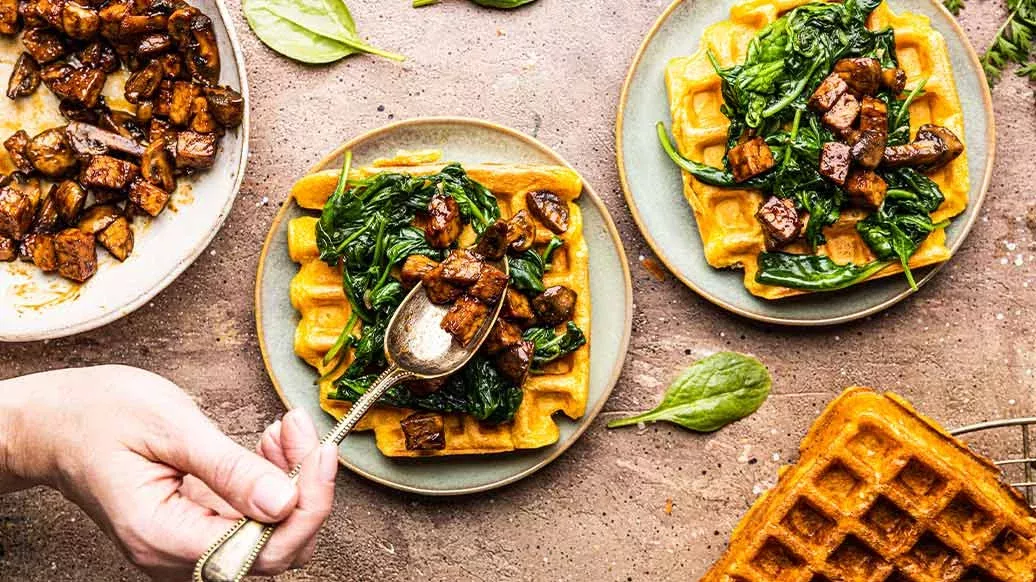 Disponi i funghi, il tempeh e gli spinaci sui waffle cotte.