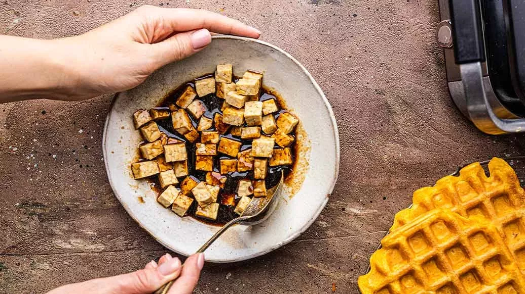 Goditi una versione completamente vegana dei tradizionali waffle. In questa versione li trovate a base di zucca e carota. Sono ideali per un pranzo sostanzioso e salutare, con un tocco piccante di tempeh. Piaceranno anche a chi non è vegano!