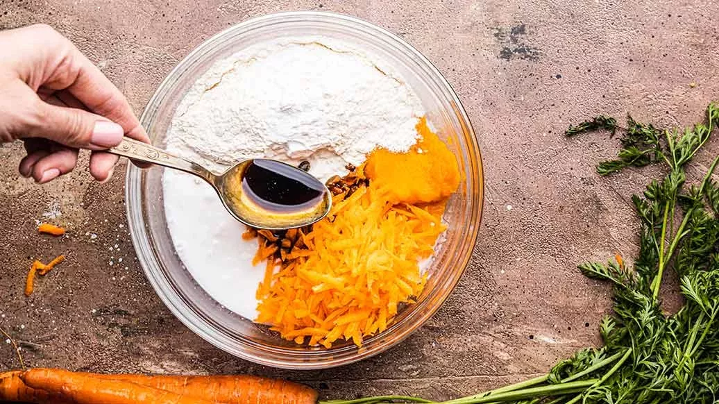 Grattugia la carota. Mescola lo yogurt con il latte vegetale, la purea di zucca, la carota, la farina, il lievito in polvere e la salsa di soia Kikkoman a ridotto contenuto di sale.