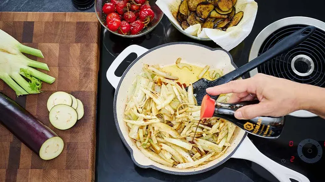Per i contorni, lava le verdure. Affetta il finocchio e la melanzana e lascia interi i peperoncini. Cuoci ogni verdura separatamente in padella con olio caldo, condendo ciascuna con la Salsa di Soia Kikkoman e il pepe.