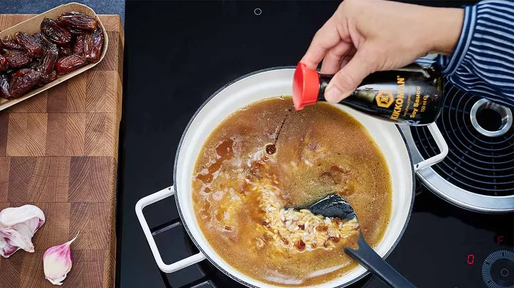 1 cucchiaio di burro – 1 cucchiaio di olio d'oliva – 100 g di pasta orzo – 4 datteri – 1 spicchio d'aglio – 200 g di riso a chicco medio (ad es. Roma o Carnaroli) – 400 ml di brodo di agnello – 3 cucchiai Salsa di Soia a Fermentazione Naturale Kikkoman