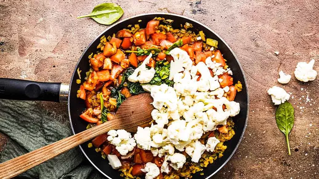 Un curry di cavolfiore e spinaci super profumato e leggermente speziato, servito con riso e frutta secca.Un mix delizioso di sapori e consistenze che ti stupirà ad ogni morso. Perfetto per un'opzione di pranzo al lavoro sana e gustosa, ma anche per un pasto in famiglia!