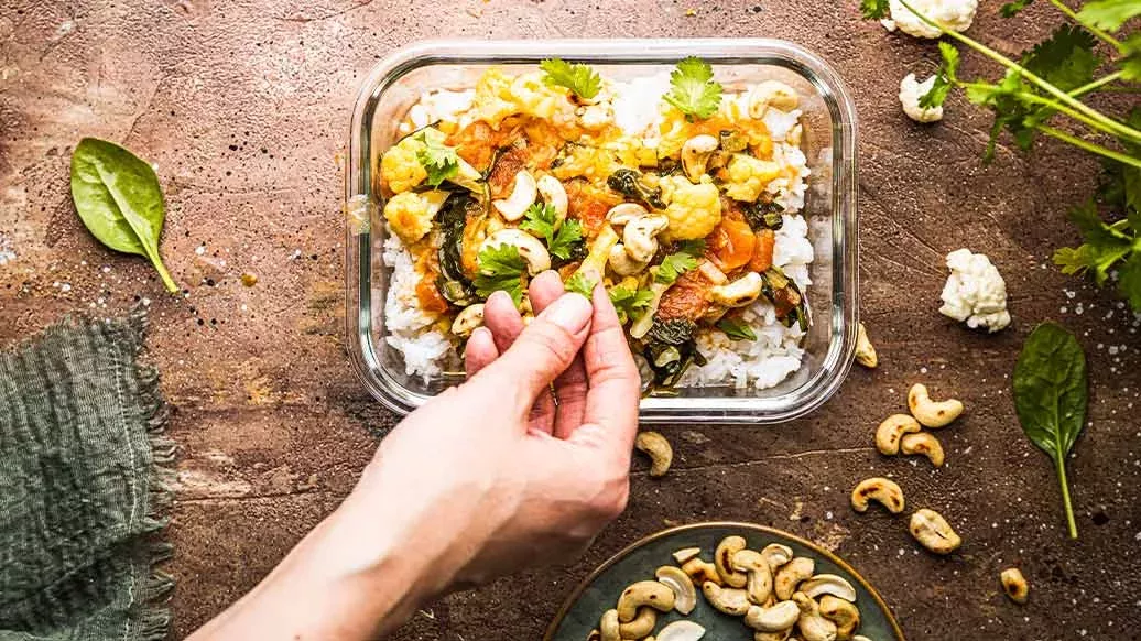 Cuoci il riso, poi mettilo nei contenitori per il pranzo. Versa sopra la salsa al curry e cospargi con gli anacardi e il coriandolo fresco.