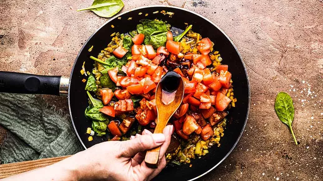 3 pomodori – 1 cucchiaio Olio di Sesamo Tostato Kikkoman – 1 cipolla – 1 spicchio d'aglio – 1 cucchiaino di pasta al curry – 50 g di spinaci – 120 ml di acqua – 1 cucchiaio Salsa di Soia a Fermentazione Naturale a Tasso Ridotto di Sale