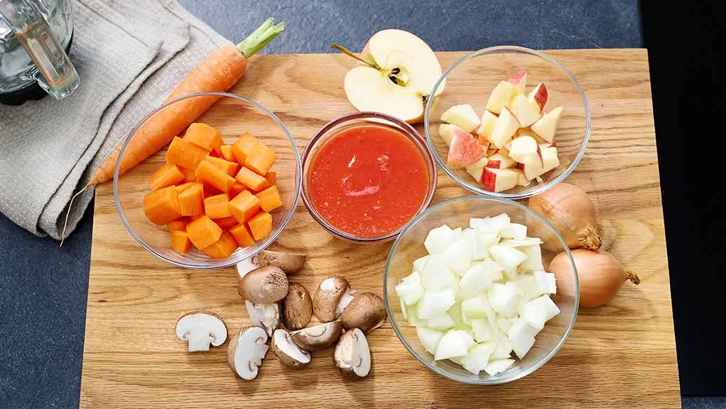 200 g di cipolla – 150 g di carota – 6 funghi – ½ mela – 150 g di pomodori pelati