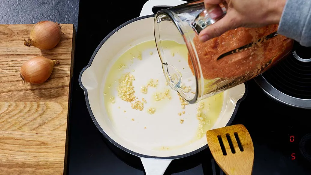 Scaldare l’olio d’oliva in una casseruola a fuoco medio. Aggiungere l’aglio finemente tritato e soffriggere finché non sprigionerà il suo profumo. Unire la purea di verdure del Passaggio 1, coprire e lasciar sobbollire a fuoco medio-basso per circa 15 minuti.