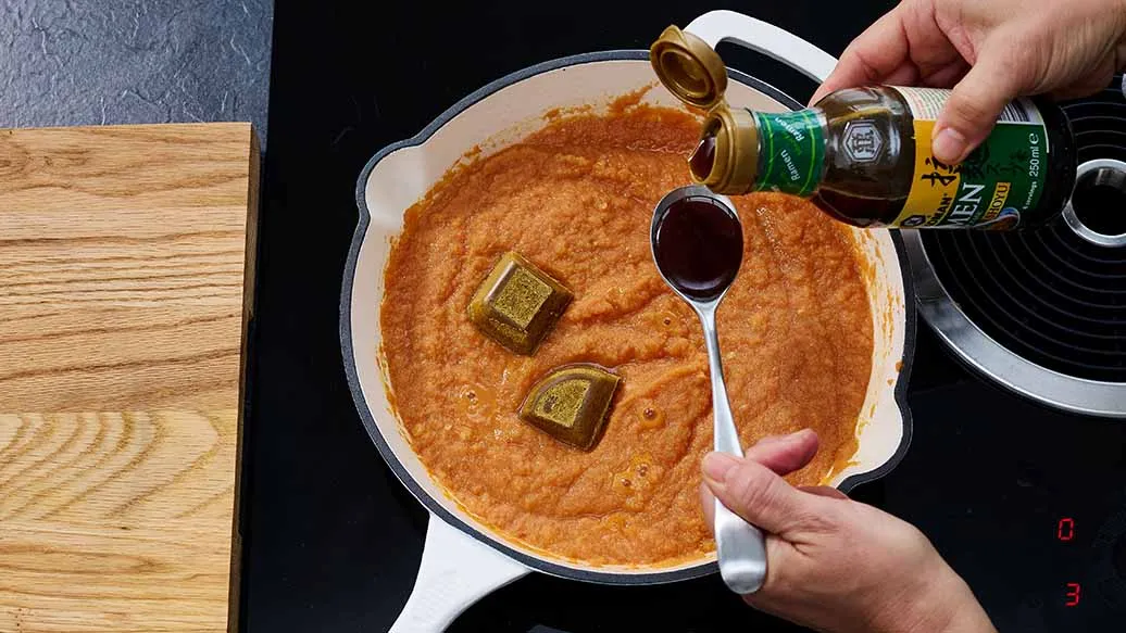 Aggiungere il preparato per curry giapponese e mescolare finché non si sarà completamente sciolto. Unire la Base per Zuppa Ramen Kikkoman.