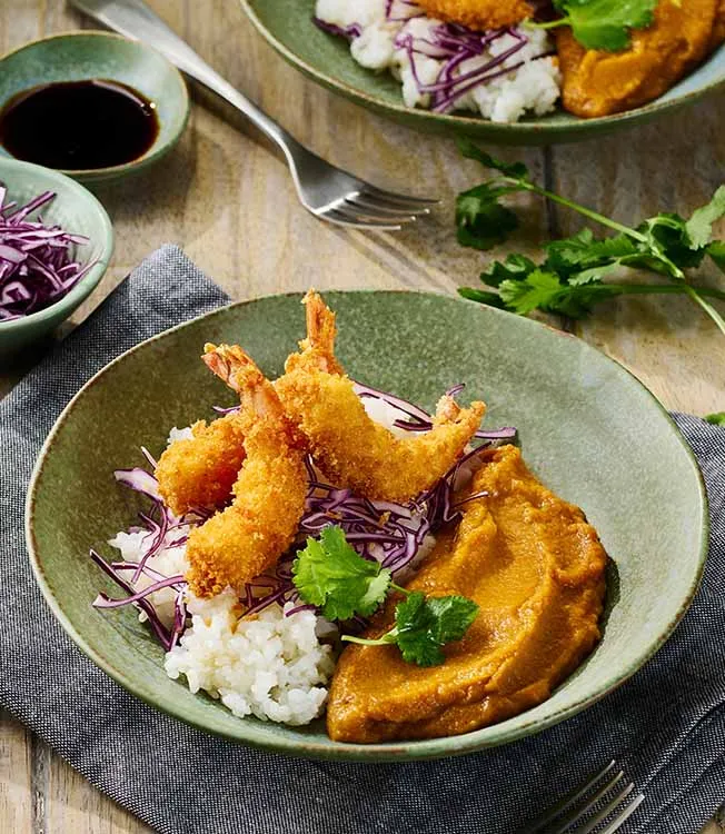 Un curry giapponese ricco ma semplice, arricchito da una purea di verdure “umami” che esalta il sapore di funghi e pomodoro. La Base per Zuppa Ramen Kikkoman intensifica ulteriormente l’umami. Il piatto viene servito con gamberi croccanti impanati nel Panko Kikkoman e cavolo finemente affettato.