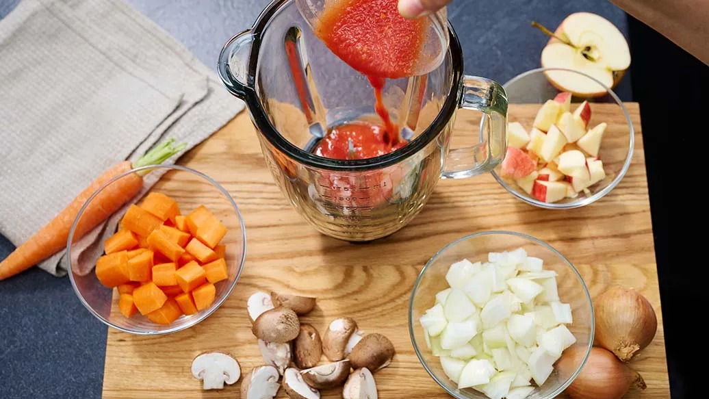 Tritare grossolanamente cipolla, carota, funghi e mela. Frullare con i pomodori pelati fino a ottenere una purea completamente liscia.