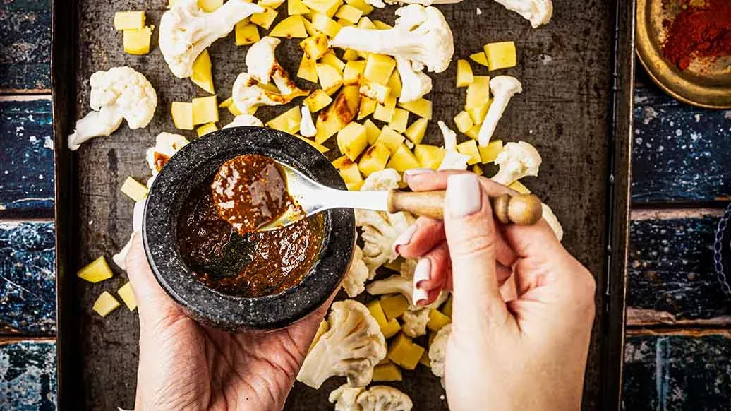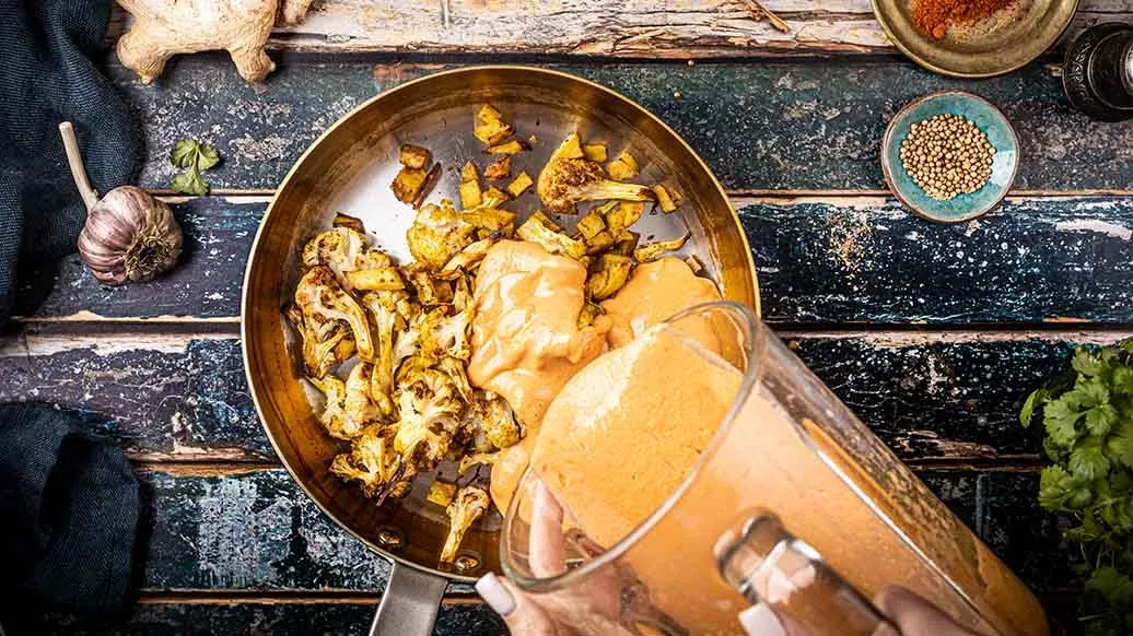 Invece di arrostire le patate e il cavolfiore in forno, puoi saltarli in padella e poi aggiungerli alla salsa.