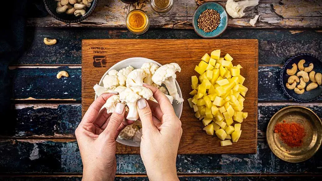 Versa l'acqua bollente sugli anacardi. Sbuccia, lava e asciuga, quindi taglia a cubetti le patate. Lava e asciuga il cavolfiore, quindi taglialo a cimette.