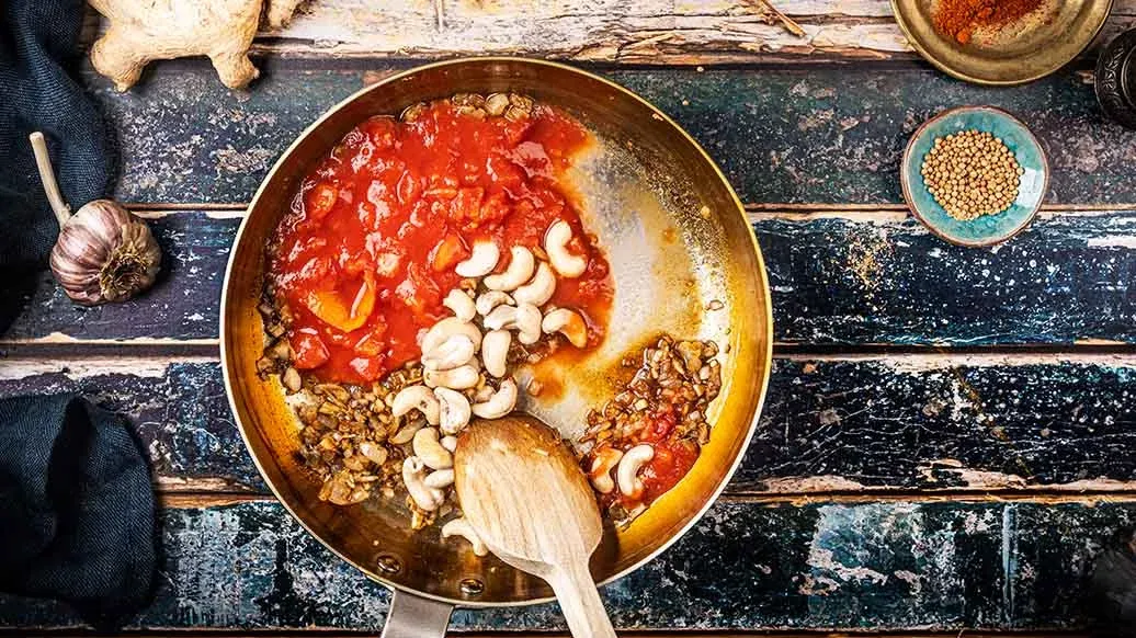 Fai rosolare la cipolla tritata in un cucchiaio di olio, fino a quando non sarà traslucida, quindi aggiungi l'aglio tritato, lo zenzero e le spezie (garam masala, cumino, pepe di Cayenna e coriandolo). Fai rosolare per 2 minuti. Aggiungi la Salsa di Soia Kikkoman, i pomodori e gli anacardi scolati dal passaggio 1. Copri e fai sobbollire per 15 minuti.