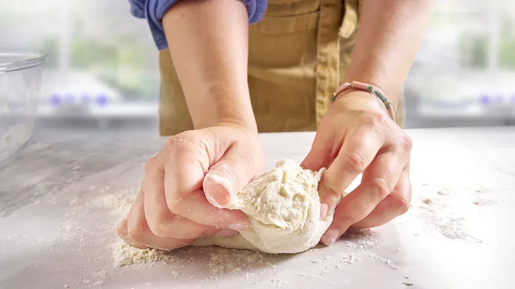 200 g di farina di frumento – 20 g di farina in più per la spianatoia – ½ cucchiaino di lievito in polvere per torte salate – ½ cucchiaino di bicarbonato di sodio – 40 ml di latte, tiepido – 75 g di yogurt bianco (o al naturale)