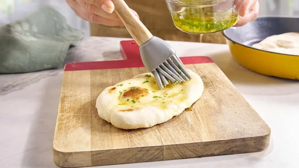 Scalda una padella antiaderente senza grassi a fuoco medio-alto e cuoci ogni focaccina per 2 minuti per lato, finché non si formeranno bolle dorate e segni di bruciacchiatura. In un pentolino, fondi il ghee, poi aggiungi l'aglio e il coriandolo tritati. Affetta la cipolla ad anelli. Spennella i naan con il burro all'aglio e servili con il dal e la cipolla. Guarnisci con le foglie di coriandolo fresco.