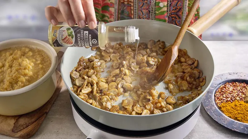 Cuoci le lenticchie nel brodo vegetale per 10 minuti. Caramella la cipolla e i funghi nel ghee per 10 minuti finché non saranno dorati, poi aggiungi il Condimento Dolce Kikkoman in Stile Mirin e salta per 1 minuto. Aggiungi cumino, curcuma e fiocchi di peperoncino e tosta per 10 secondi per sprigionare gli aromi. Incorpora le lenticchie e cuoci per 5 minuti.