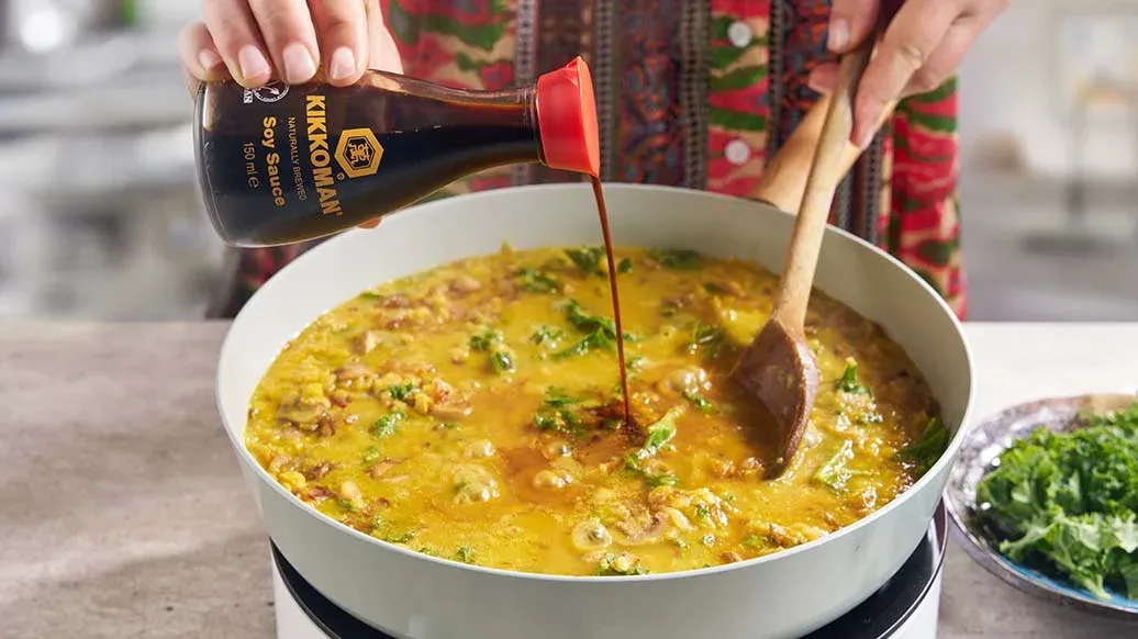Un Dal di lenticchie rosse con cipolle caramellate, funghi e un mix di spezie calde, arricchito dalla Salsa di Soia Kikkoman e dal Condimento Dolce Kikkoman in Stile Mirin. Da servire con morbidi panini "pav" e peperoncino fresco per creare un equilibrio perfetto tra una profonda sapidità e una delicata dolcezza.