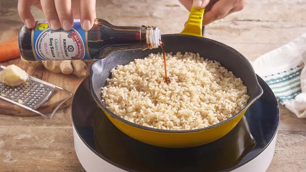 100 g di riso integrale (ad es. Sona Masoori) – 30 g di burro chiarificato (ghee) – 30 g di scalogno, tritato – 2 spicchi d'aglio, tritati – 1 cucchiaio Salsa di Soia Tamari a Fermentazione Naturale Senza Glutine Kikkoman – 1 peperoncino verde, a fettine